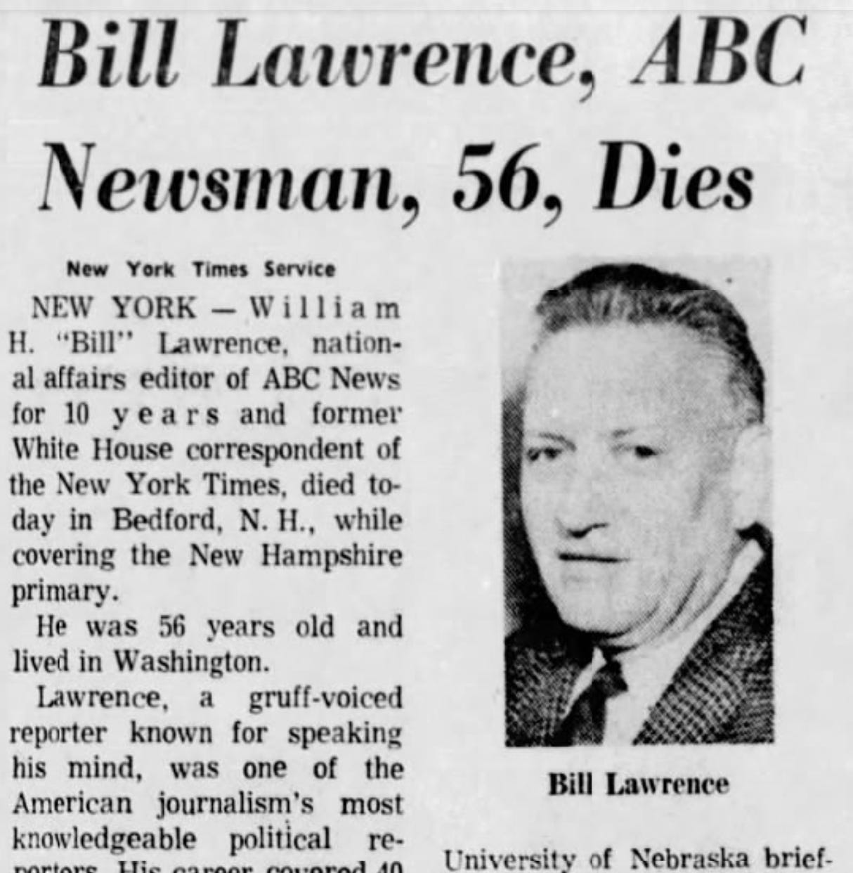 It’s February 29th, “leap day” in Manchester, New Hampshire. That’s where we would do our live broadcast about the primary two nights later. It was a Sunday night and maybe half a dozen of us had decided to go out to dinner and would meet in the lobby of our suburban Wayfarer Motor Inn at 6 o’clock. Five of us showed up, but not Bill. He was senior in age to any of the rest of us, so we waited, and waited, and waited, until finally, knowing that Bill was a heart patient, someone got worried. She went to the front desk and asked for the key to his room.