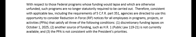 This memo a week ago from the Office of Management and Budget warned that if there is a shutdown, “Agencies are directed to use this opportunity to consider Reduction in Force notices for all employees in programs, projects, or activities that satisfy all three of the following conditions: (1) discretionary funding lapse, (2) another source of funding is not currently available; and (3) (they) are not consistent with the President’s priorities.”