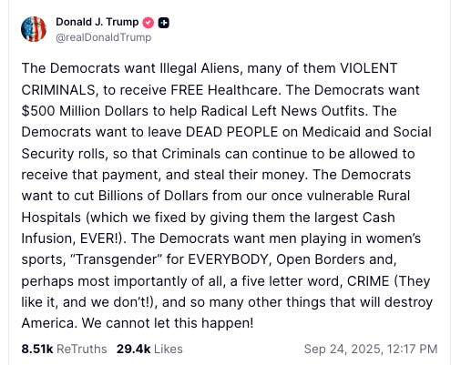 The second example of fear: Trump and his vice president have been putting it out there that the money the Democrats are fighting for, the money they want to spend to keep health insurance affordable, is for illegal immigrants. Vance said on X, “Democrats are about to shut down the government because they demand we fund healthcare for illegal aliens.” Trump, in his deliberately dark style, said on his website, “The Democrats want Illegal Aliens, many of them VIOLENT CRIMINALS, to receive FREE Healthcare.”