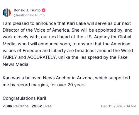 She ran two years ago for Arizona governor and lost. She ran this year for Arizona senator and lost. But as a strident election denier who has ceaselessly regurgitated propaganda about our elections being rigged— she’s as perfidious as Trump— she has never conceded defeat in either race, let alone Trump’s irrefutable 2020 loss. Yet Wednesday he endorsed her to lead the Voice of America, the agency that promotes America’s values to the rest of the world, particularly human rights. It is America’s counterbalance to propaganda from autocrats.